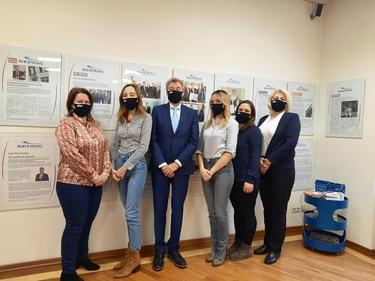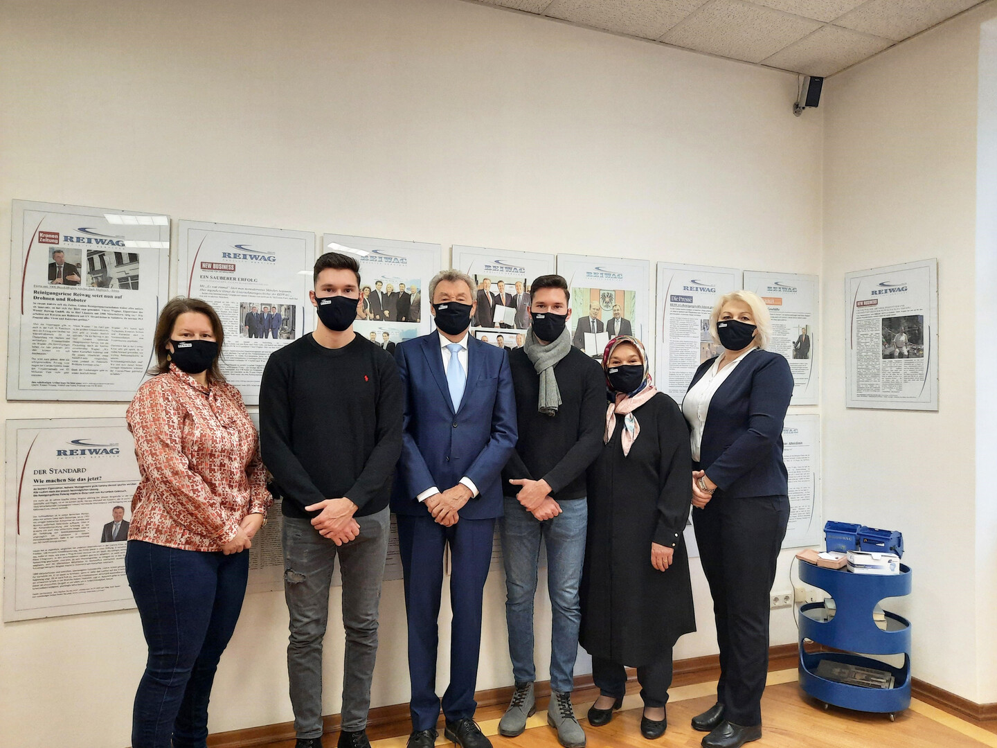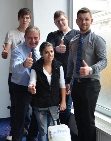 Október 2014 Reiwag Facility Services dali trom mladým ľuďom možnosť nezáväzne okúsiť profesionálnu oblasť čistenia pamiatok, fasád a budov. Sprevádzal ich ich pracovník s mládežou zo siete NEBA.Okrem teoretického výkladu a praktických cvičení mali Pinar (16), Emir (17) a Michael (19) možnosť priamo na mieste spoznať aj denný režim našich zákazníkov. Náš prevádzkový manažér, pán Kai-Uwe Böhrnsen (na obrázku vľavo), ako aj niektorí manažéri našich divízií (na obrázku pán Sascha Wunsch, DM) boli veľmi ohromení veľkým záujmom a pozitívnou spätnou väzbou od troch mladých ľudí.